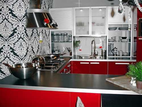 Роскошные обои с вычурным узором белого цвета на черном фоне подчеркивают респектабельность красно-черного интерьера кухни