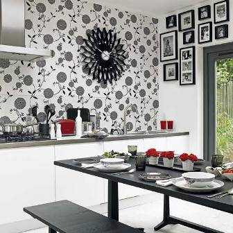 Сдержанно-элегантно выглядят эти изящные черно-белые обои на просторной кухне, оформленной в контрастной цветовой гамме