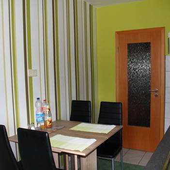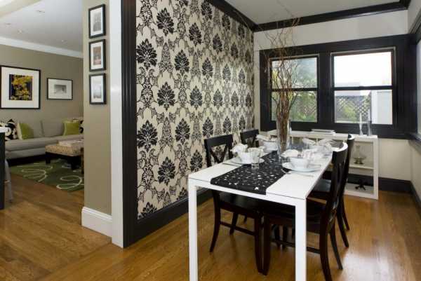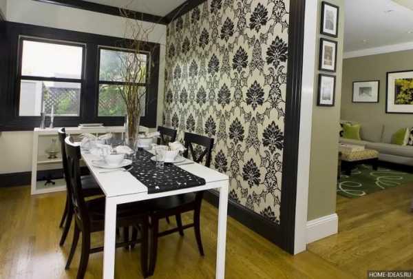 Хорошим решением будет выделение обеденной зоны с помощью обоев другого рисунка