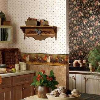 В таком случае обои-компаньоны двух или более видов должны полностью сочетаться. Поклеить такой вариант – занятие трудоемкое и сложное, так как необходимо правильно подобрать вид и структуру одежды для стены, аккуратно составить и наклеить маленькие полотна на стену кухни, что бы стыки, не бросались в глаза.