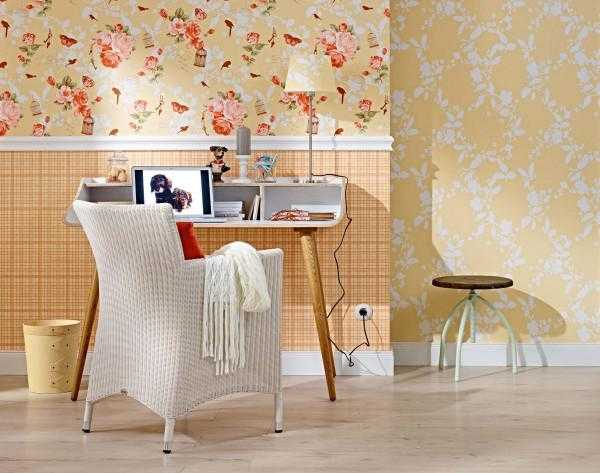 - Цветочный орнамент хорошо сочетается с обоями, повторяющими рисунок деревянной поверхности, геометрические фигуры с абстракцией.