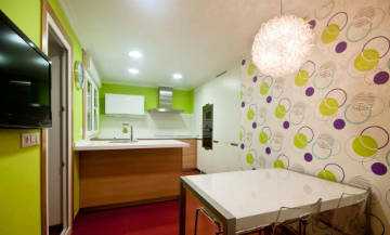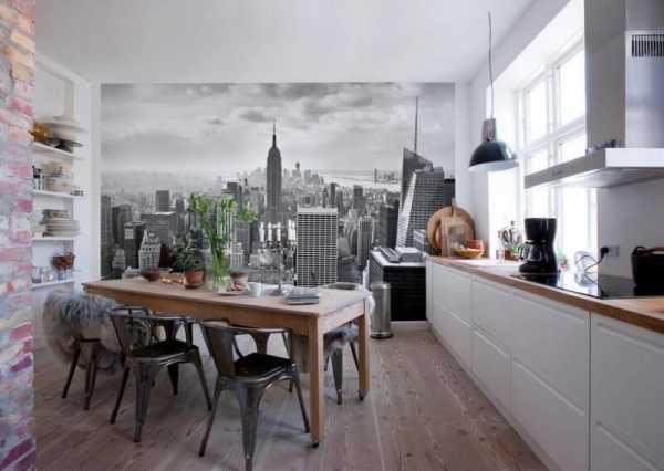 При вытянутой в длину кухне создается эффект вагона, но если оформить противоположную к входу стену обоями с нетрадиционным рисунком или фотообоями, то стена визуально приблизится. Хорошо смотрится акцент на стене рядом с кухонным столом. Яркие обои в этой части позволят создать радостное настроение в момент приема пищи.