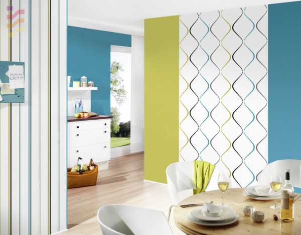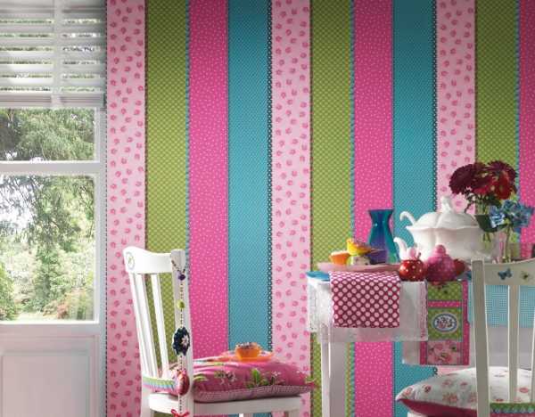 | Вертикальное | Необходимо приобрести покрытие с одинаковой фактурой и шириной, но разные по цвету. Соответственно, во время наклеивания полосы будут чередоваться. На своё усмотрение можно решить ширину полос, какой цвет станет доминирующим. По цветовому решению: монохромные родственные оттенки или контраст на яркости. Возможно использование рисунка или узора. Края могут обрезаться, зигзагом или волной |