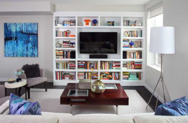 В просторной гостиной большой площади уместны шкафы для хранения книг, стеллажи для цветов и предметов декора. Мебель такого типа может быть размещена на стене с телевизором. Эффективным решением является установка компактных стеллажей в углах комнаты. Книжный шкаф во всю стену часто размещается у стены с телевизором, а техника монтируется внутри корпусной мебели.
