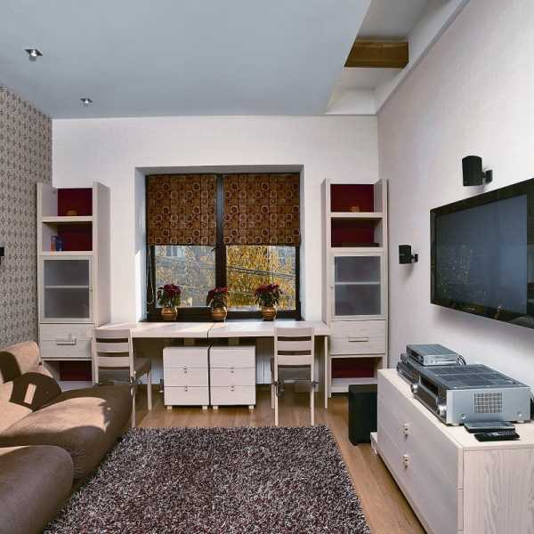 - С одной стороны располагается диван и журнальный столик, по другую сторону – стенка или шкаф;