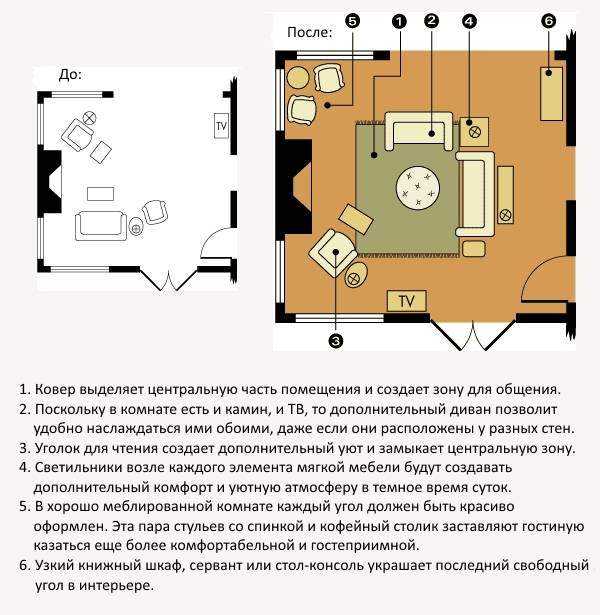 Ниже вы найдете рекомендации по правильному выбору мебели, интересные и разнообразные варианты её расположения, а также фотографии гостиных до и после перестановки. Приступим!