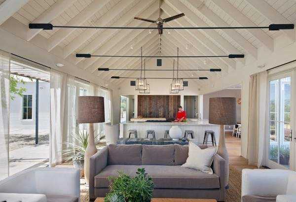 В плане расстановки мебели владельцам загородных домов можно позавидовать. Частные владения имеют большие площади и отличаются высотой потолков, количеством и размерами окон. Имея в наличие большое помещение с большими окнами, легко создать просторный и светлый зал. От яркого света необходимо защититься полупрозрачным тюлем. Между двух окон в идеале ставится стол, по обе стороны от которого будут прекрасно смотреться мягкие кресла: сидя на них можно наслаждаться прекрасным видом на сад.