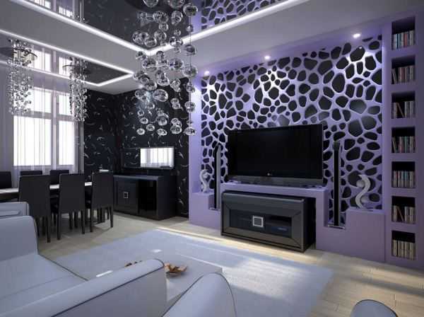 Если же зал будет оформляться в ультрасовременном стиле, то можно использовать обои из фольги, которые являются еще непривычным для нашей страны покрытием. Помимо привлекательного вида, они обладают звуко- и теплоизоляцией, а также некоторыми другими хорошими эксплуатационными свойствами.