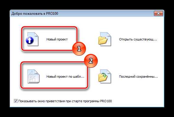 - Сразу же после запуска PRO100 откроется окно приветствия, где создается новый проект или комната по шаблону. Выберите наиболее удобный для вас вариант и приступайте к проектированию кухни.