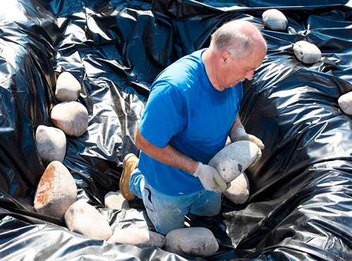 Если размер котлована оказался больше размера плёнки, её следует укладывать с перехлёстом не меньше чем 50 см. в итоге под плёнкой должны оказаться дно, стены и береговая линия. Позже её неприглядный вид спрячется за декоративными элементами.