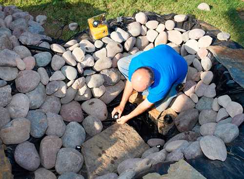Конструкцию разумно спрятать под камнями, чтобы сохранить эстетику. Шланг, который предполагает выталкивание воды, необходимо подключить к самому насосу, а на дне оставить шланг, втягивающий воду.
