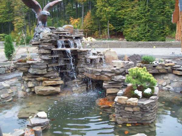- Каскадный водопад. При такой конструкции, вода спускается в водоём по нескольким ступеням, которые в основном выполняются из камней с характерными угловатыми формами. Это может быть сланец или гранит, в зависимости от цветовых предпочтений хозяина. Можно поиграть с наклоном ступеней, чтобы вода создавала несколько маленьких водопадов.