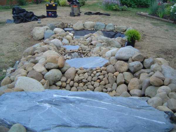 После укладки изоляции, дно будущего дачного водопада засыпают небольшим слоем мелкого гравия, он послужит своеобразной «подушкой» и убережёт водоём в случае движений грунта.