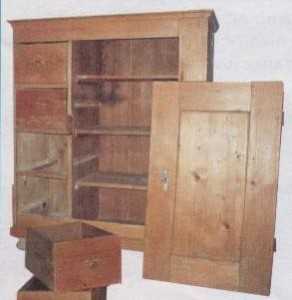 - Шкафы хвойных пород обновить можно так: поверхность обработать металлической щеткой для создания характерных борозд. Затем древесина покрывается темной краской, и пока краска не высохла, по мебели проходятся тканью. Этот процесс называется патированием.