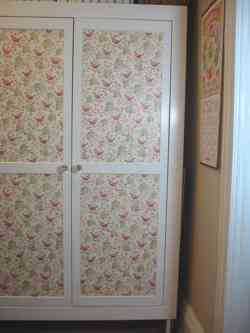 Для этой цели можно использовать различные картинки, вырезанные из салфеток, которые наклеивают на внутренности шкафа и его дверцы.