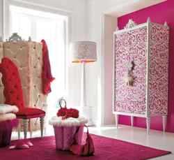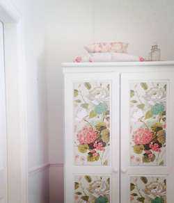 При подходе к дизайну интерьера со стороны сочетания цветовой гаммы мебели, обоев и штор, можно применить технику декупажа тканью. Шкаф обретет гармонию и изящество в сочетании с остальными элементами декора.