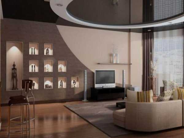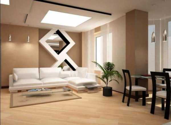 Для отделки зала в стиле модерн выбирают такие материалы, как гипс, металл, пластик, стекло и т.п.