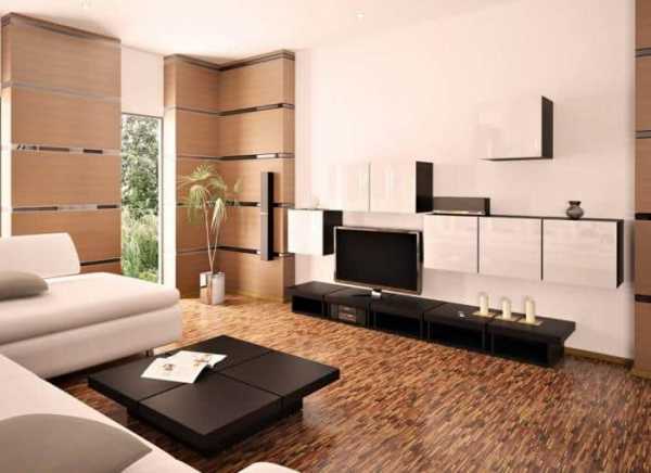 В современных залах всегда много свободного пространства. Главный акцент интерьера делается на диване, который задает тон всему интерьеру.