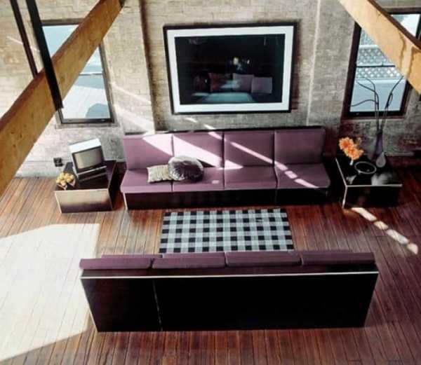 В зале стиля лофт обязательно присутствует большой удобный диван, обтянутый кожей или дорогой тканью и, конечно же, потертый и искусственно состаренный. Диван украшает множество мягких подушек, по бокам – кресла и пуфики для ног.