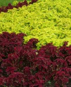 Его простая форма листа — овал и простой цвет дополняет большинство оттенков, кроме, голубого и пурпурного. Тонкие вены в бордовой листве Колеуса балансируют с мягкими розовыми или бледно-желтыми, а также цветом яркой фуксии или ярким апельсиновым.