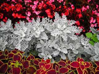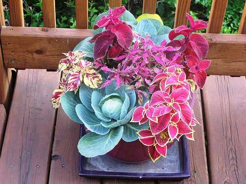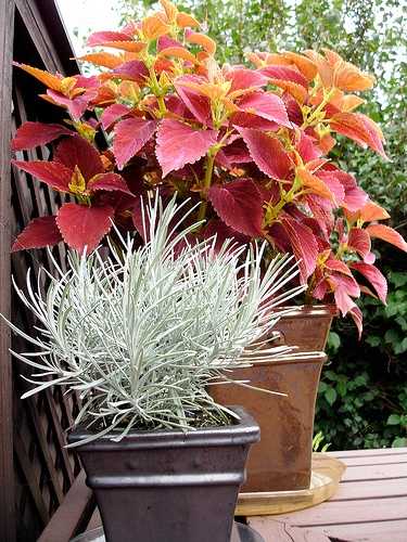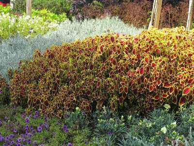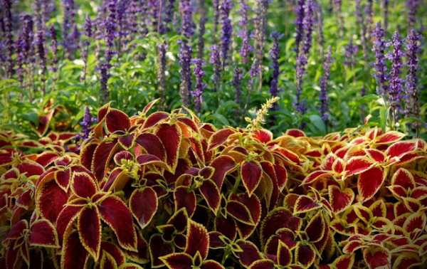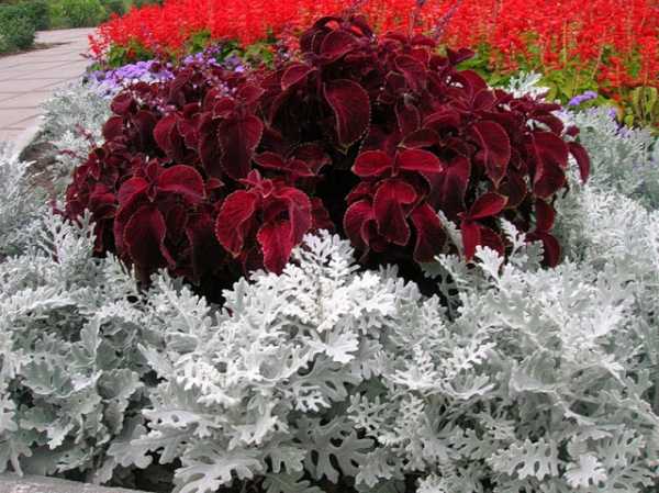 У колеусов очень красивые пестрые листья, поэтому они прекрасно смотрятся в сочетании с такими растениями, у которых однотонные листья. Лучше всего подойдут цинерария, шалфей, овсяница сизая. Такие растения будут подчеркивать яркие необычные листья колеуса, создавая им выгодный фон. Клумба, составленная из различных растений, будет выглядеть очень декоративно.
