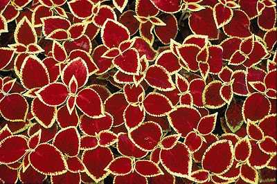 Листья: Колеус, щеголяет красивыми, порой причудливо разрисованными листьями. На них — крупные и мелкие пятна, полосы, штрихи, жилки красного, золотистого, желтого, коричневого, фиолетового, темно-пурпурного и других цветов в самых оригинальных сочетаниях. У колеусов часто встречаются контрастная основной окраске кайма. Листья бывают разной формы: сердцевидные, овальные, продолговатые, с волнистыми или зубчатыми краями.