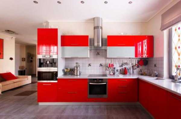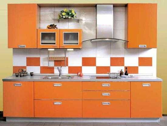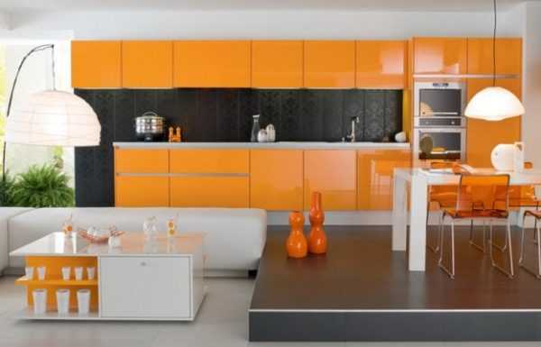 Кухонный гарнитур из яркого оранжевого глянцевого пластикаНо такое решение допускается только в помещениях средних размеров с окнами, выходящими на юг. Отсутствие яркого освещения может оказаться фатальным.