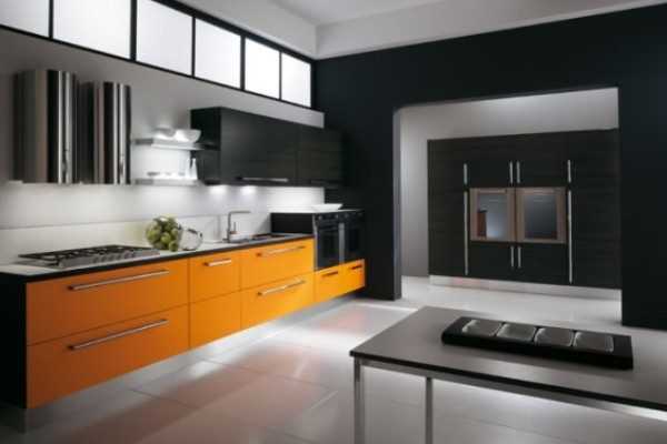 - Кухня в минималистском стиле – конструктивизм, техно, хай-тек, – наоборот, использует поверхности, особенно светоотражающие, как основной инструмент интерьера. Здесь оранжевый низ с бело-черной столешницей будет вполне к месту. На следующем фото – кухня в черно-оранжевой гамме в стиле хай-тек.