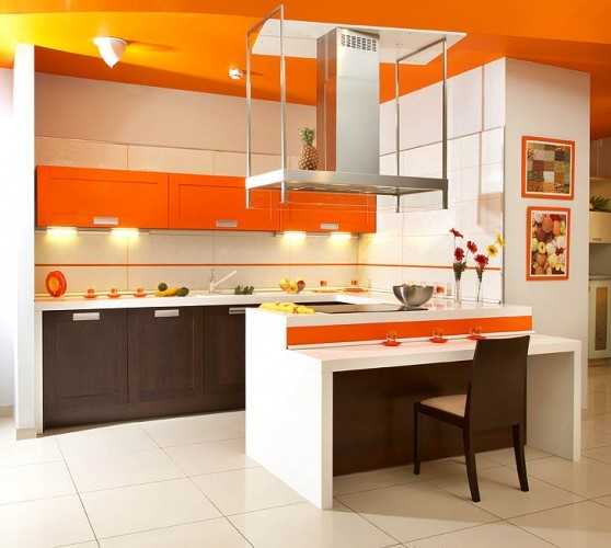 - При средних размерах кухня вполне допускаются оранжевые обои и потолок чуть более светлого оттенка. Для пола – кафель или линолеум, его имитирующий. Ламинат или паркет возможны, но только соответствующего оттенка. Низ и верх гарнитура лучше оформить белым. На фоне ярких стен мебель будет выделяться и казаться более объемной, что компенсирует красочность отделки.