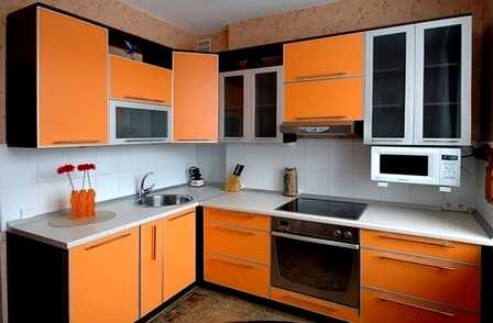 - В Г-образном варианте, если одна часть гарнитура сильно втянута, угол визуально как бы «проваливается». Избежать этого можно, выбрав оранжевый фасад для углового модуля. Верх это будет или низ – значения не имеет.