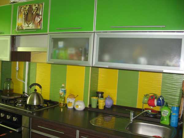 Цветовую гамму для кухни я выбрала желто- зелёную,кухня получилась очень светлая,удобная и модная!!!!!Обои взяли для покраски и сделали их тоже желто- зелёными (в тон нашей кухни).На потолке нарисовали цветочный орнамент и разукрасили его краской для обоев.Этой же краской я нарисовала такой же орнамент на стёклах дверей в кухню.Эти мелочи придали нашей новой кухне ту оригинальность, которой я добивалась!!!