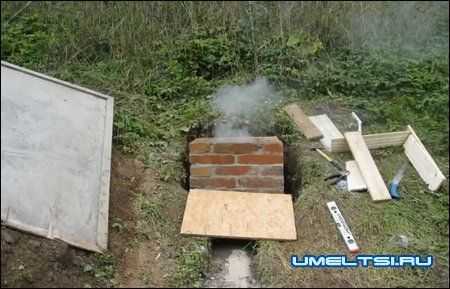 Для топки выкапывается яма, в которую укладывается жестяной лист. Это необходимо для того, чтобы процесс тления топлива осуществлялся равномерно. Дымоход представляет собой траншею, рекомендуемые размеры были указаны ранее. Сверху она накрывается любым материалом, устойчивым к горению, например, шифером и присыпается грунтом.