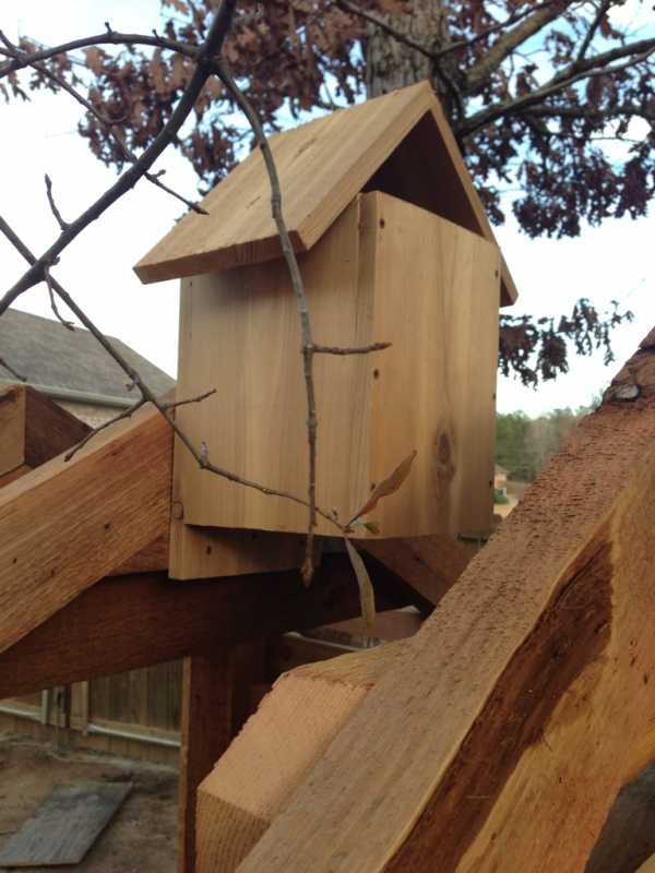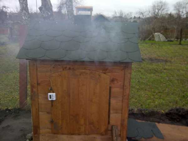 Когда стропильная система коптильни готова, приступаем к ее обшивке. В данном примере, крыша деревянная, а если вы заботитесь о долговечности конструкции, то лучше обшейте ее кровельным железом. На крыше устанавливается дымоход-отдушина в виде скворечника. Он служит для удаления из коптильни лишнего дыма.