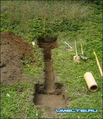 - Штольней-дымоходом может послужить врытая траншея глубиной 0,3 метра и шириной не более 50 см. Дно и стенки необходимо выложить проглинянным кирпичом, прикрыть сверху листом металла и прижать тяжелым предметом (крышка топки может деформироваться). Вместо кирпича вполне пригодна к использованию печная труба.