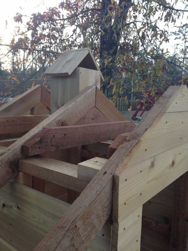 Затем, приступаем к строительству стропильной системы. С одной стороны сделан напуск, который будет служить крышей дровяника. С помощью такой конструкции у вас всегда будет запас сухих дров.