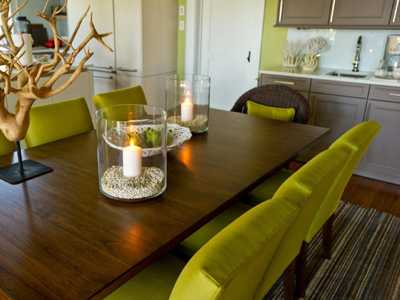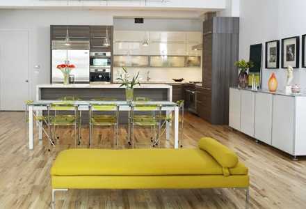 Вводя необычный предмет мебели в интерьер или используя обычный предмет в необычной обстановке (например, как кушетка в открытой просторной столовой), использование такого яркого цвета, как зеленовато-желтый, является определенным заявлением. Отражающие поверхности в других местах, например, тонированные акриловые стулья, на самом деле вносят в дом дух шартрез.