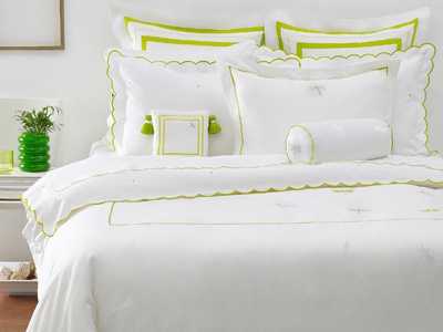 Для яркого, прохладного акцента зеленовато-желтая отделка на белых постельных принадлежностях выглядит свежо и привлекательно. Она не слишком слащавая, не слишком кислая, а такая как надо. Сочный цвет зеленых растений в такой же вазе помогает в целом палитре быть более живой.