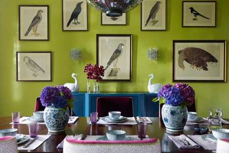 Драматические глянцевые стены цвета шартрез подчеркнут красивые высокие потолки в элегантном обеденном зале. Кислотный тон зеленовато-желтого цвета, украшенного богатыми серыми драпировками, аксессуарами и темным деревом. Результат? Яркое, потрясающее место, чтобы пообедать.