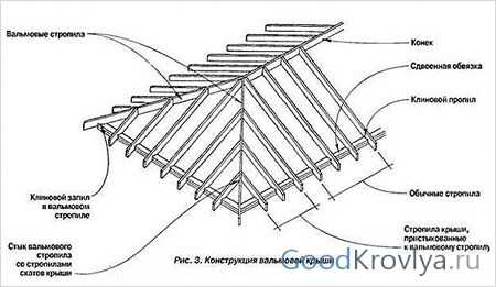 Такой тип кровли состоит из двух скатов треугольной формы (вальмов) и двух трапециевидных скатов Вальмовая крыша называется четырехскатной. Если форма дома сложнее прямоугольника, скатов может быть и больше. Все скаты опущены до карниза. Фронтоны отсутствуют, чердачные окна, при необходимости, монтируются непосредственно на скатах. Конструкция может быть как прямой, так и ломаной.
