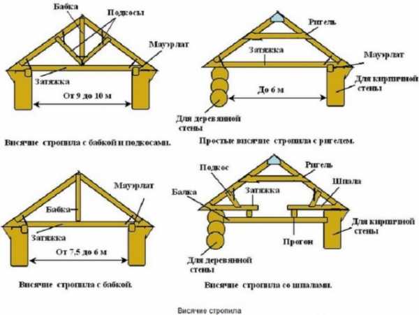 Основные элементы стропильной системы, которые могут применяться для обустройства двускатной крыши при строительстве частного одноэтажного здания, приведены на фото: