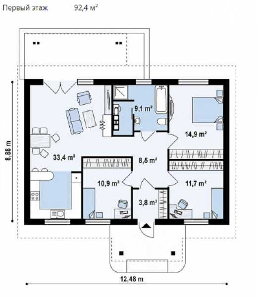 Отсутствие несущих стен предоставляет шанс без проблем изменить внутреннюю планировку одноэтажного частного дома. Камин в центре гостиной создаст неповторимую ауру домашнего уюта в холодный сезон. Открытая терраса гостеприимно встретит гостей и не заслонит проникновение солнечных лучей.