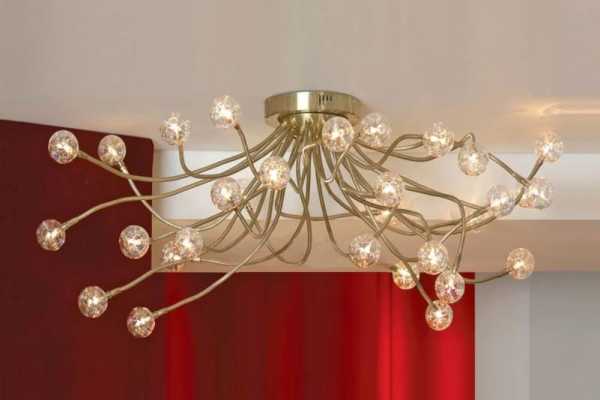 Фото люстры в квартиреОт правильного выбора люстры зависит не только интенсивность освещения квартиры, но и дизайн помещения. В первую очередь при покупке обращают внимание на технические характеристики светильника. Предпочтение отдают моделям с экономным потреблением электроэнергии. Хорошо, если есть возможность регулировать режим и мощность освещения. Кроме этого следует обратить внимание на то, какие патроны установлены в люстре. Они могут быть разного диаметра и изготавливаться из разного материала. Патроны из термостойкого пластика, керамические или карболитовые считаются более надежными и выдерживают большую температуру нагрева лампы.