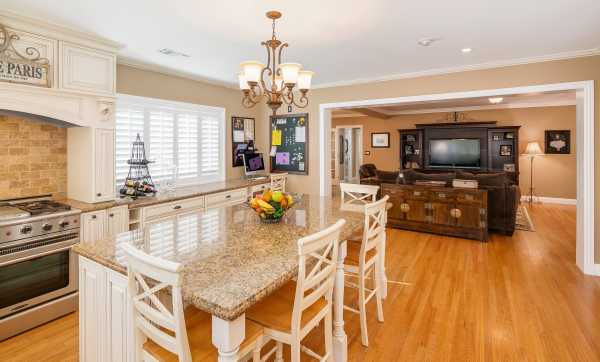 Большая кухня с трудом может обойтись одной люстрой. Исключение составляют лишь удлиненные модели с несколькими лампами в ряд. Таким устройством можно осветить большее пространство. Как вариант можно использовать разновидности, оснащенные двумя группами рожков. Одни из них направлены вниз и дают местное освещение, другие смотрят вверх и дают более рассеянный общий свет. Для такого прибора можно использовать регулятор яркости света.