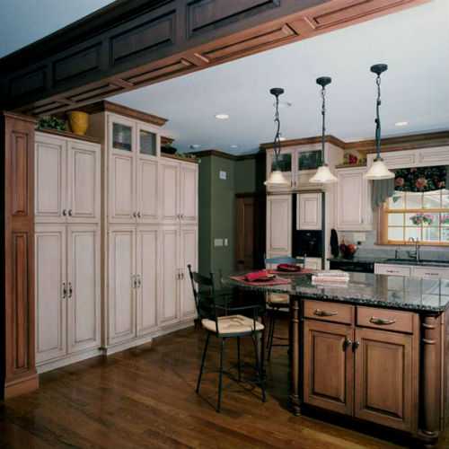Альтернативой такому приему может быть использование сразу двух люстр в одной кухне. С их помощью можно выделить две зоны: рабочую и столовую или осветить дополнительно барную стойку.