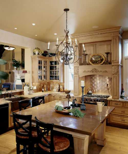 Кованая люстра с декоративными лампами-свечками в дизайне кухни в стиле кантри.