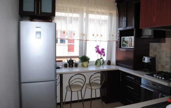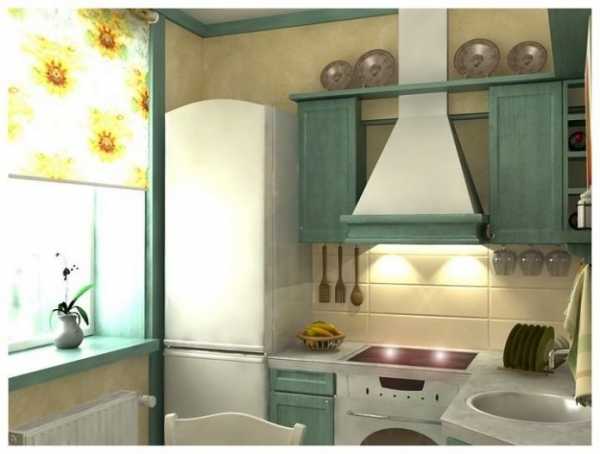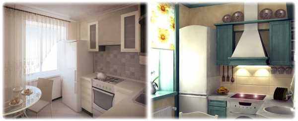 Что касается холодильника, то для маленькой кухни хорошо будет смотреться расположение холодильника (или другого вытянутого габаритного предмета, например шкафа) в самом дальнем углу помещения. Это визуально расширит пространство и приподнимет потолок.