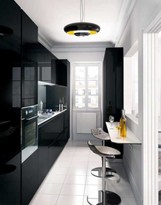 Узкая длинная кухня также может быть оформлена стильно и органично. Чёрно-белая гамма не кажется мрачной из-за блестящего покрытия. Белый пол придаст помещению чистоты и визуально увеличит высоту стен. Небольшая барная стойка, прикреплённая к стене, позволит провести время за чашкой чая или бокалом вина. Оригинальная люстра добавит настроения и завершит композицию.