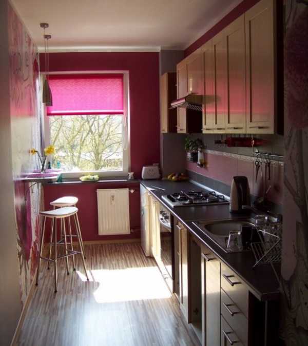 В узкой кухне сложно разместить обеденный стол и всю необходимую мебель. Для полноценного приёма пищи предполагается гостиная. Узкая столешница выполняет роль барной стойки. Мебельный гарнитур расположен на противоположной стороне. Глубокий розовый цвет около окна и цветочный принт на другой стене разбавит тёмную палитру.