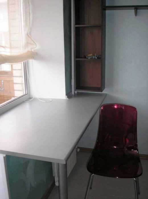 Если же имеется не только оконный проем, но и дверь на балкон, то можно рядом установить тумбу или полки для мелкой бытовой техники под окном либо утеплить лоджию и объединить помещения.