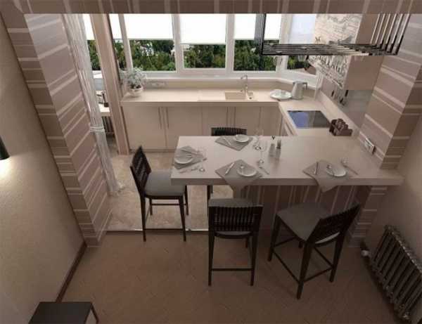 При объединении кухни с лоджией можно оставить место для организации обеденного стола